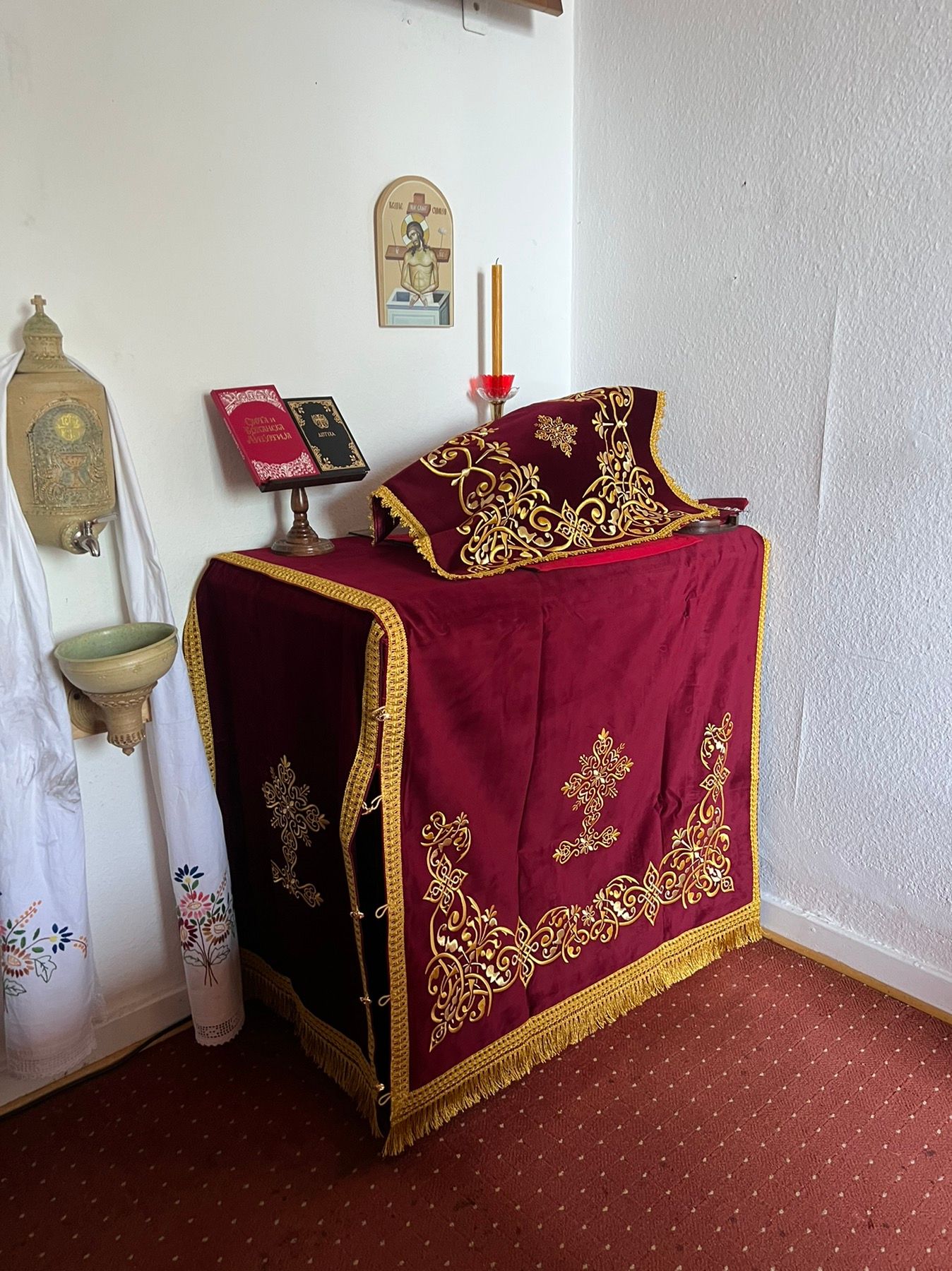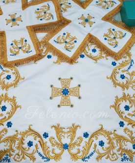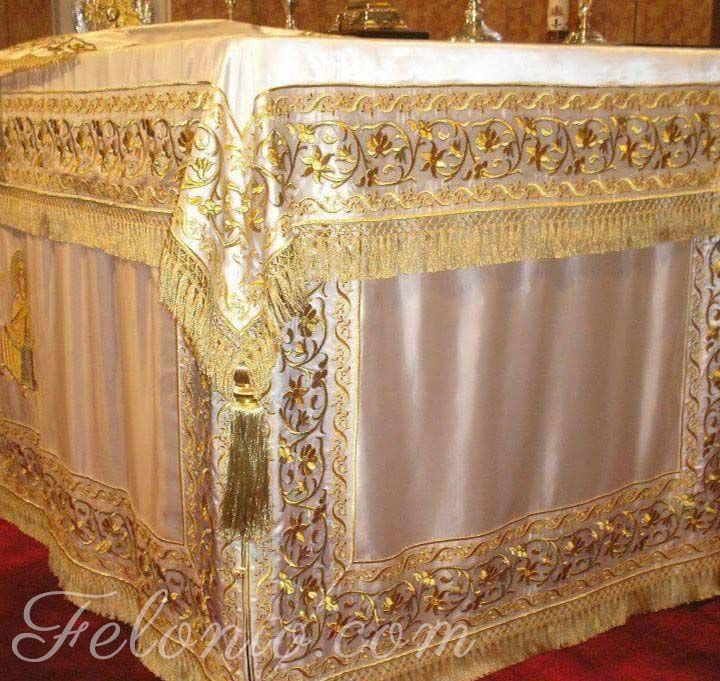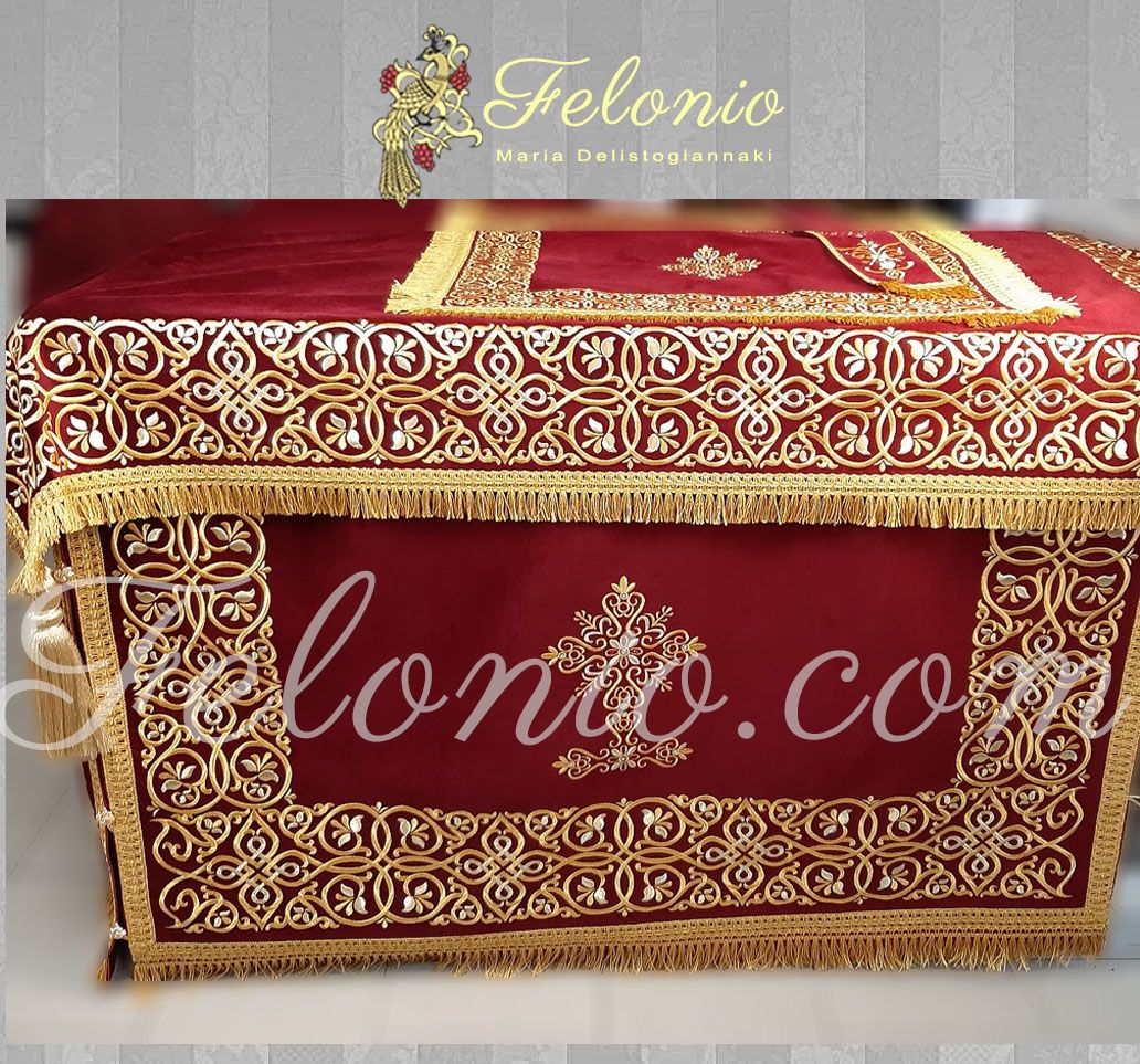 Στο ιεροραφείο ΦΕΛΟΝΙΟ, στη Θεσσαλονίκη, δημιουργούμε και λειτουργικά άμφια, κεντητά δηλαδή καλύμματα της Αγίας Τράπεζας, των ιερών σκευών και των επίπλων του ναού.